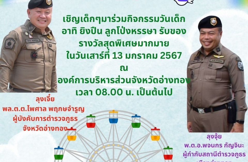 ข่าวฝากประชาสัมพันธ์ 01 10 มกราคม 2567 โดย admin / ข่าวประชาสัมพันธ์,ข่าวฝากประชาสัมพันธ์ ลุงๆตำรวจใจดี @ผู้ติดตาม ตำรวจภูธรจังหวัดอ่างทอง และสถานีตำรวจภูธรเมืองอ่างทอง เรียนเชิญ ผู้ปกครองทุกท่านพาเด็กมาร่วมกิจกรรมมากมายที่บูธของตำรวจ อาทิ กิจกรรมยิงปืนสุดสนุก ได้รับความรู้ ลูกโป่งหรรษา และได้ของรางวัลพิเศษติดไม้ติดมือกลับบ้าน ณ องค์การบริหารส่วนจังหวัดอ่างทอง เวลา 08.00 น. เป็นต้นไป แล้วมาพบกันลุงตำรวจกันนะค้าบบบบบบ #ตำรวจภูธรจังหวัดอ่างทอง #ตำรวจภูธรภาค1 #สำนักงานตำรวจแหงชาติ Facebook iconFacebookTwitter iconTwitterLINE iconLine