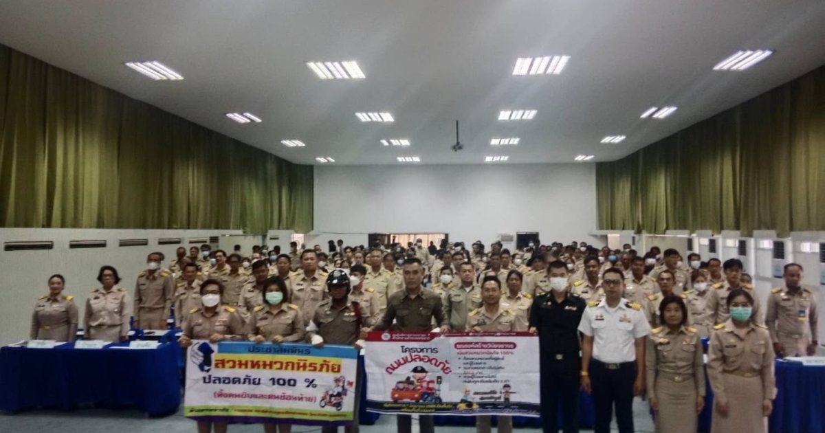 หอประชุมอำเภอเมืองอ่างทอง ให้สวมหมวกนิรภัย ทั้งคนขับคนซ้อน ฯ และให้กำนัน – ผู้ใหญ่บ้านช่วยประชาสัมพันธ์ประกาศเสียงตามสายในหมู่บ้านให้ประชาชนในหมู่บ้านทราบถึงโครงการถนนปลอดภัย