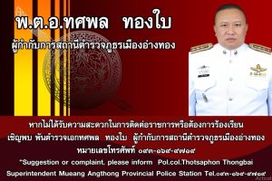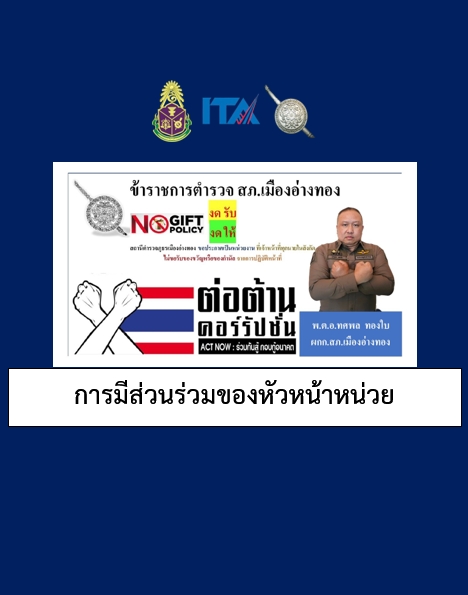 พ.ต.อ.ทศพล ทองใบ ผกก.สภ.เมืองอ่างทอง หัวหน้าสถานีตำรวจ ได้มีนโยบายในการต่อต้านการรับสินบน มาใช้ในหน่วยงาน และมีกิจกรรม เผยเเพร่และสร้างการรับรู้ให้ข้าราชการตำรวจในสังกัดมีความเข้าใจ เพื่อป้องกันการทุจริตในหน่วยงาน