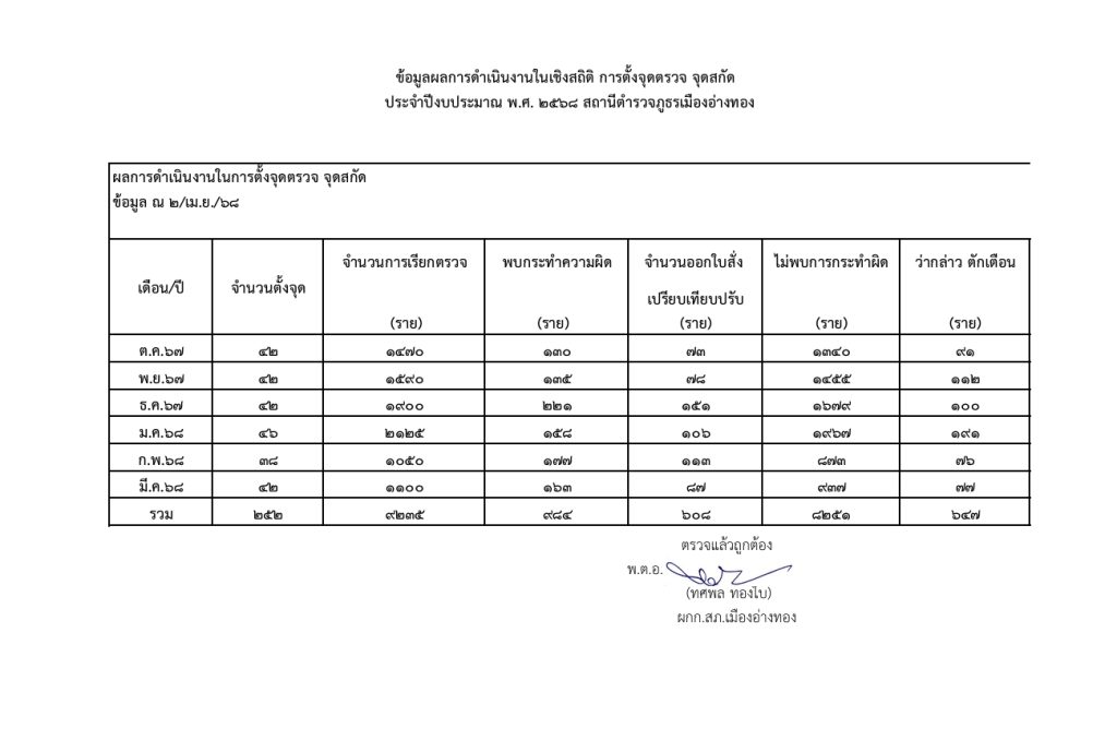 2.ข้อมูลผลการดำเนินงานเชิงสถิติในการตั้งจุดตรวจ จุดสกัด ของ สภ.เมืองอ่างทอง